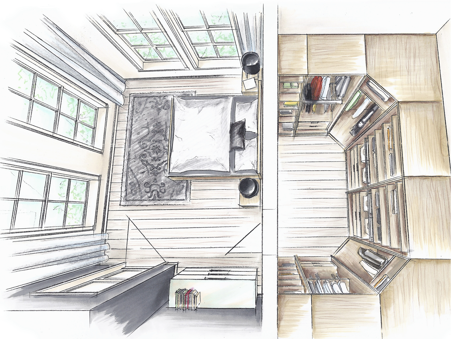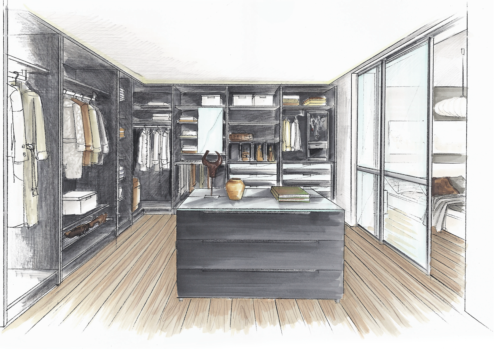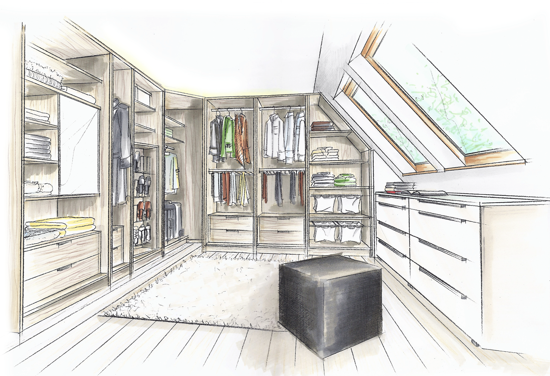 Colorierte Handzeichnungen für das Schranksystem Horizont 3000 für Printmedien